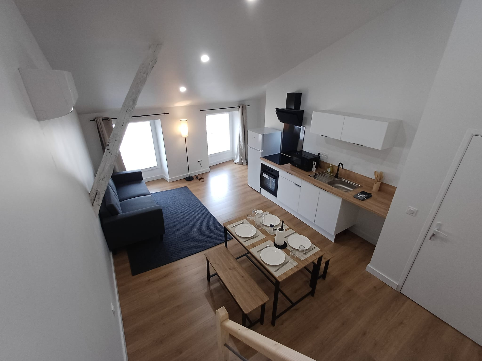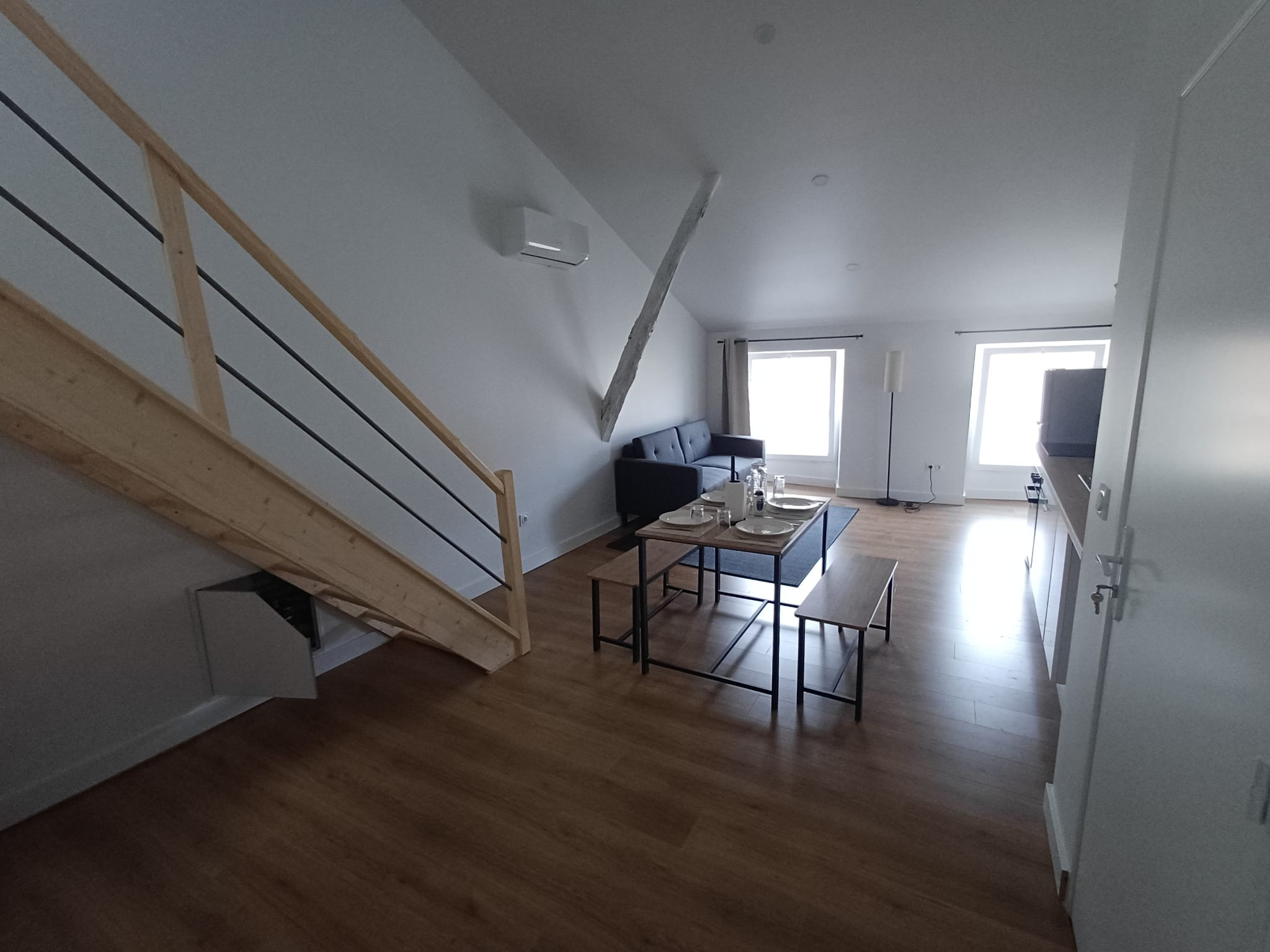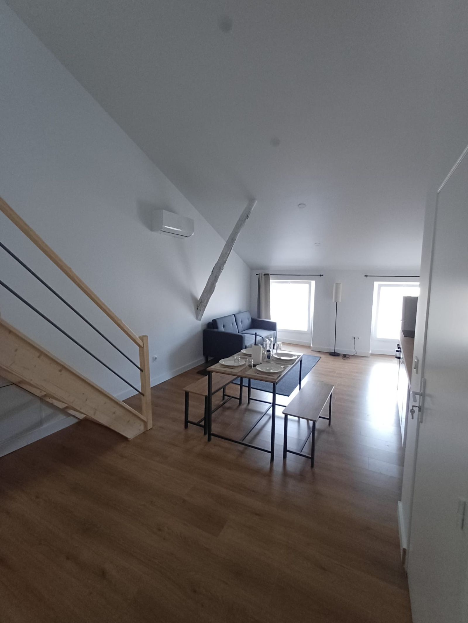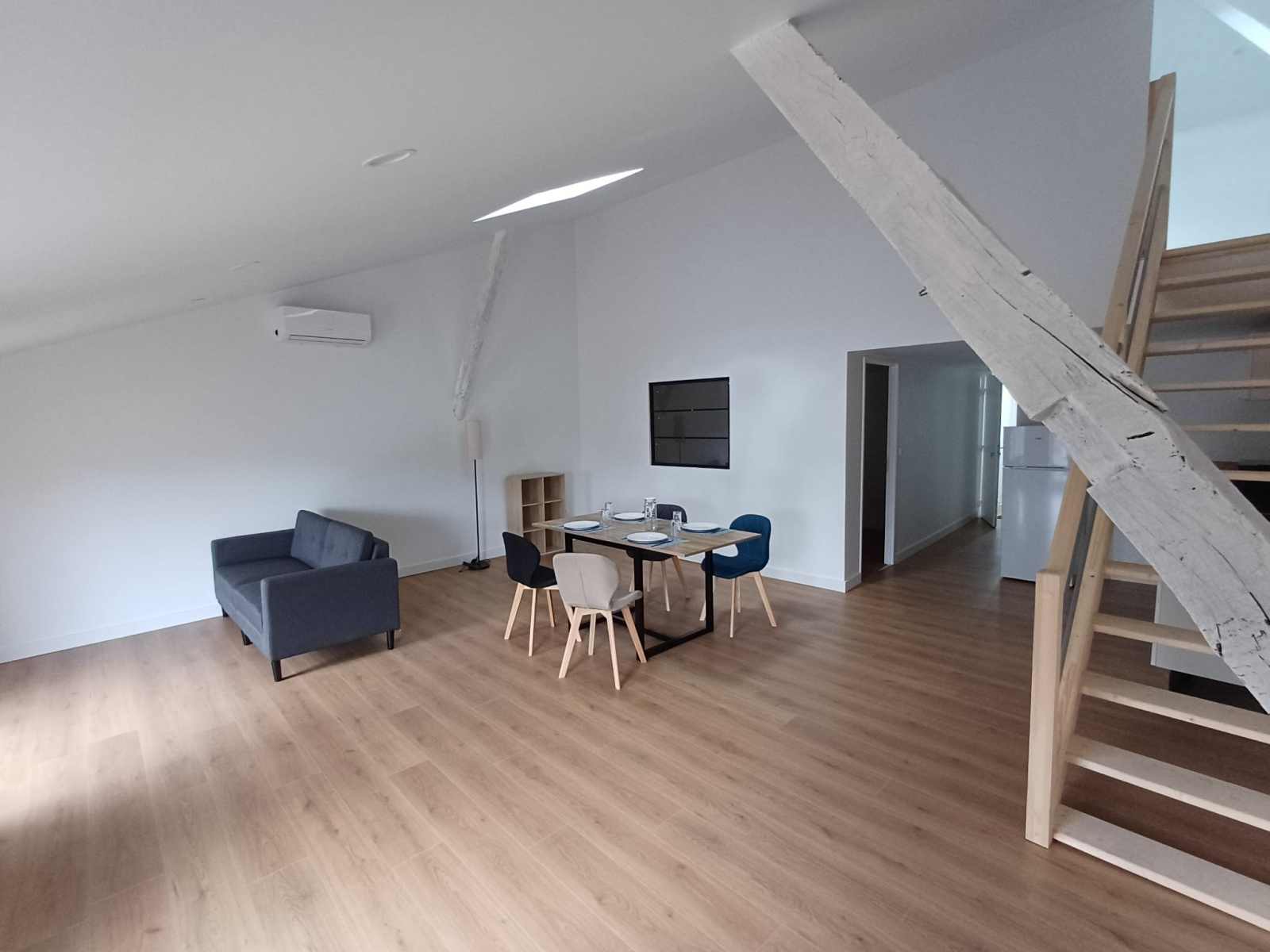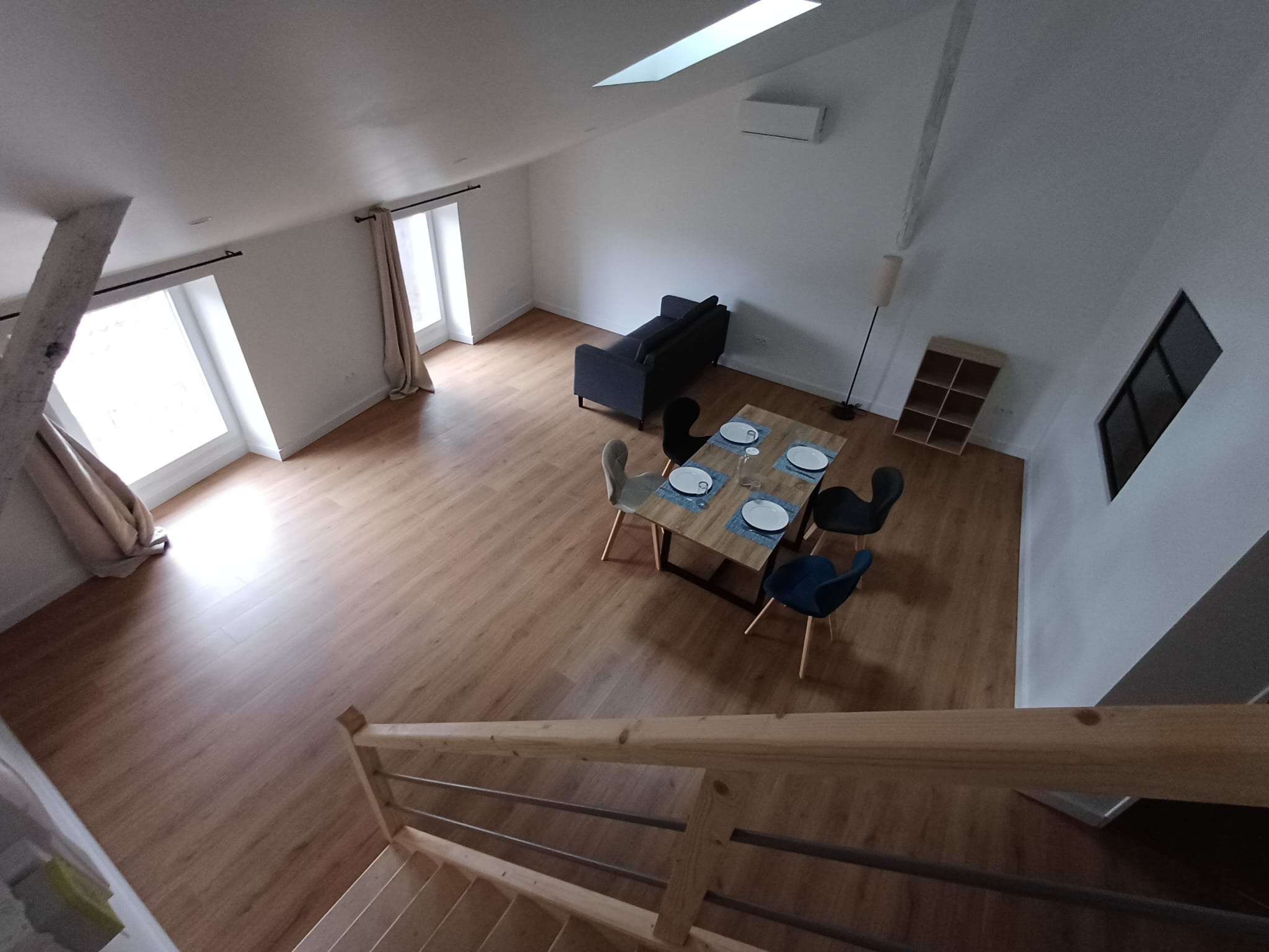 Au dernier étage, un charmant T3 avec mezzanine, entièrement meublé, bénéficiant d’une climatisation réversible pour un confort optimal en toute saison.