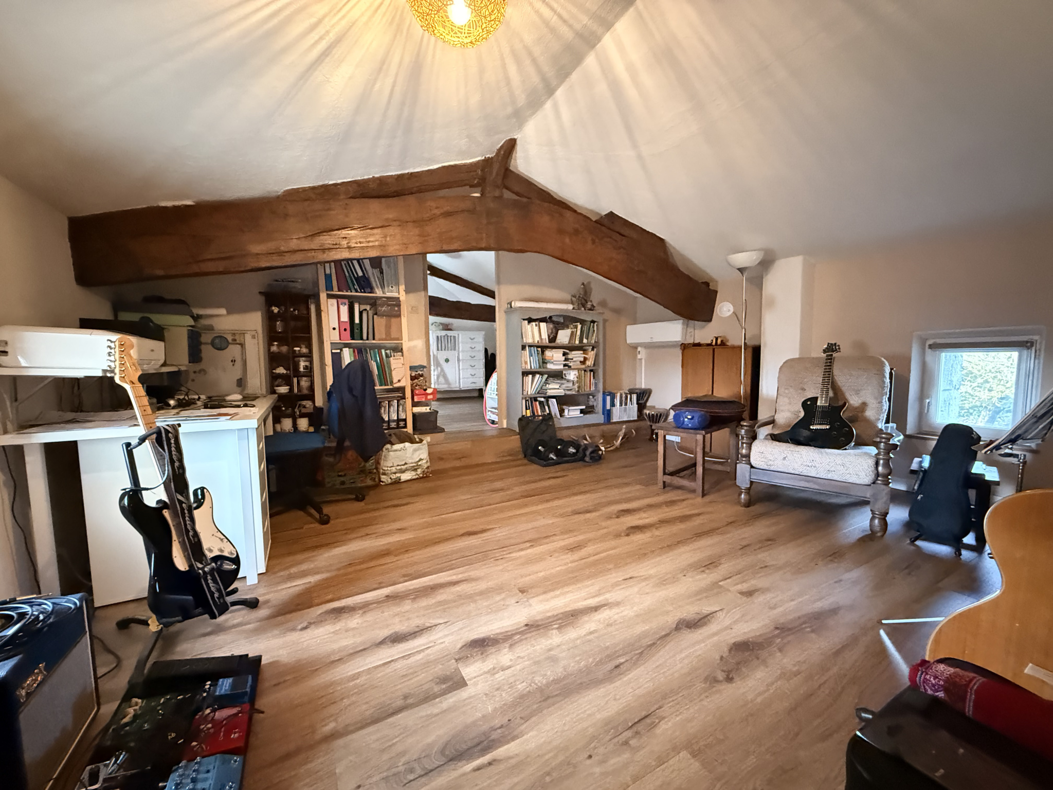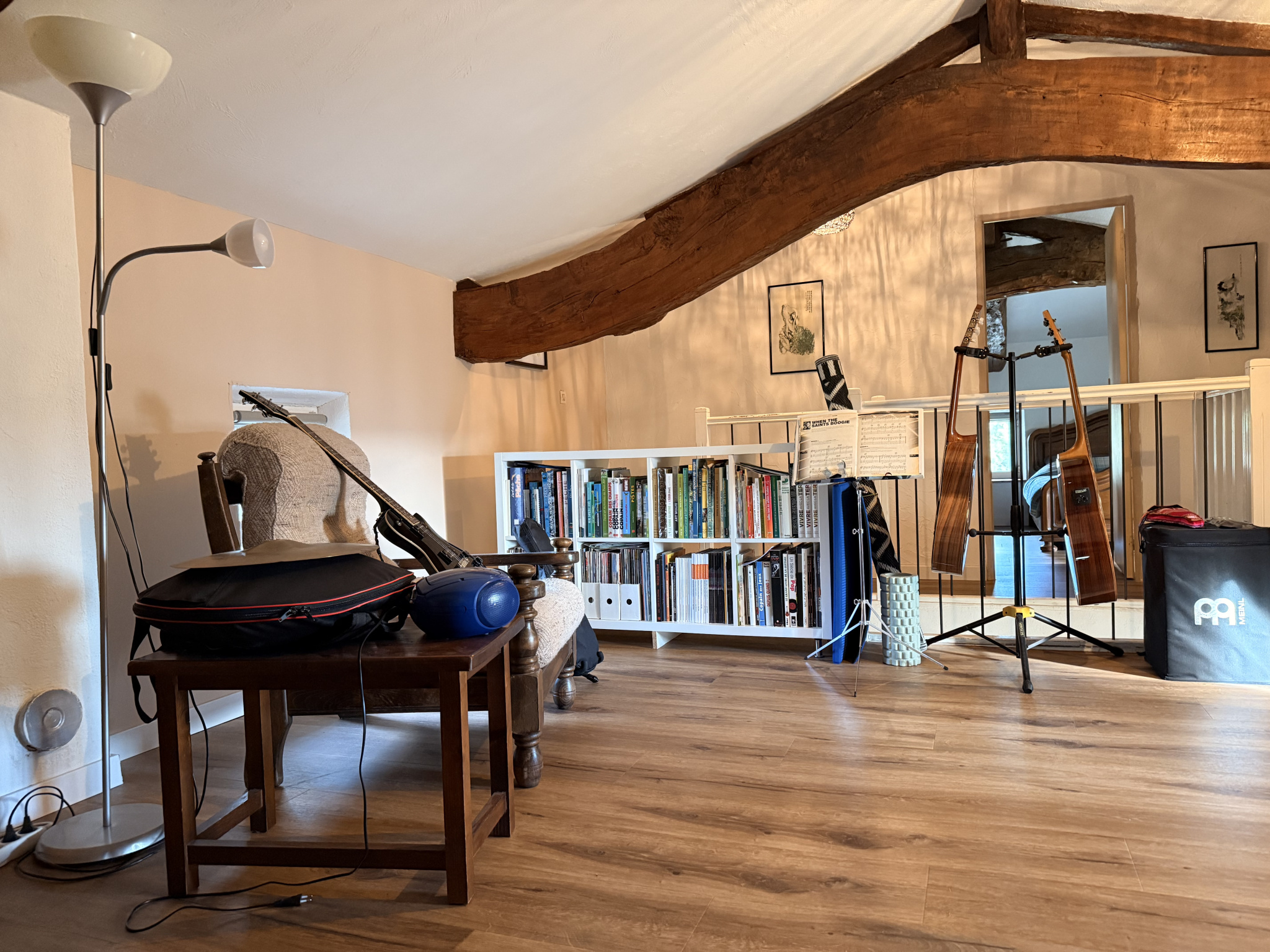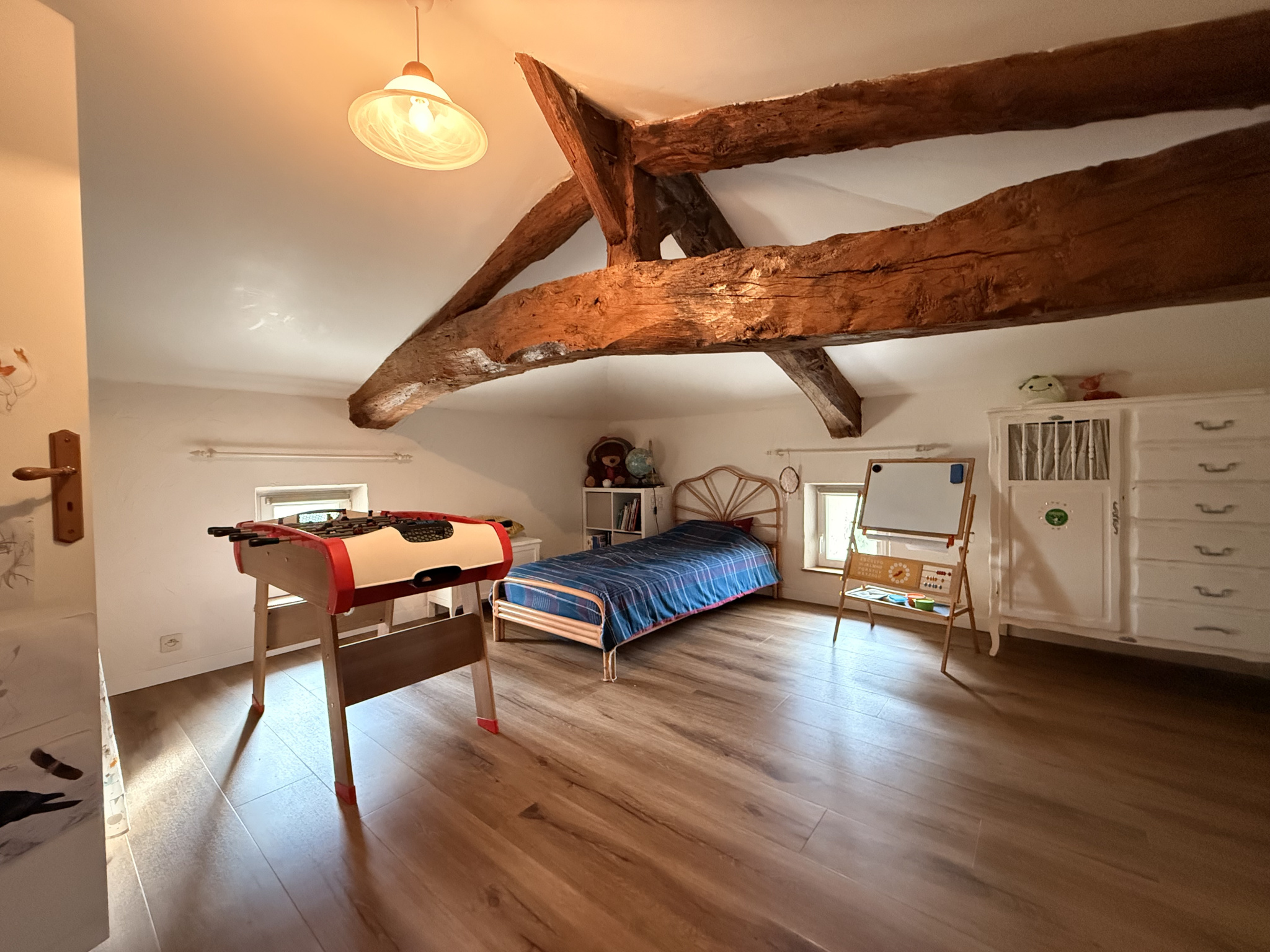 À l’étage, vous découvrirez deux belles chambres ainsi qu’une mezzanine centrale, espace polyvalent pouvant accueillir un bureau, une bibliothèque ou une salle de jeux selon vos besoins.