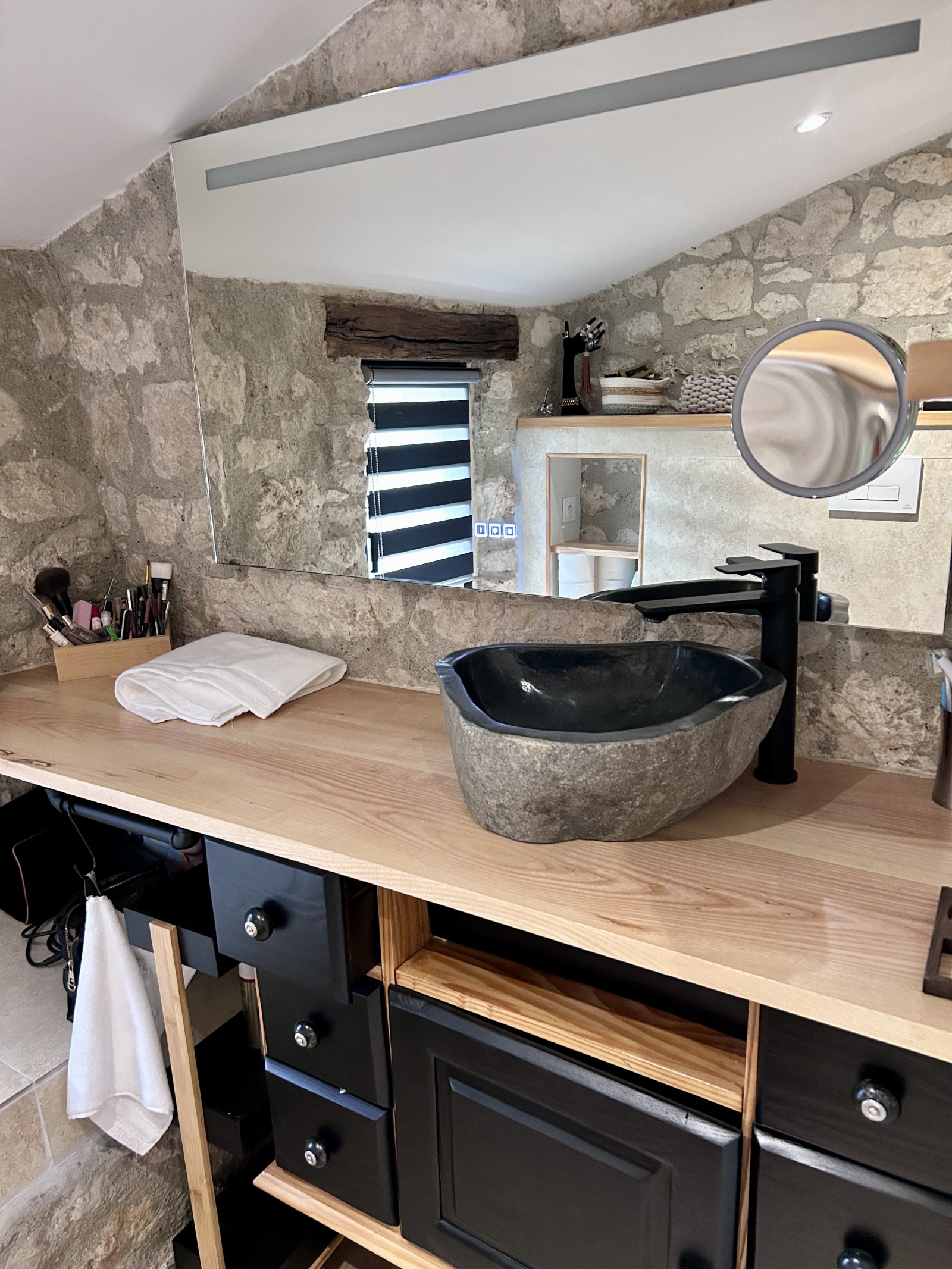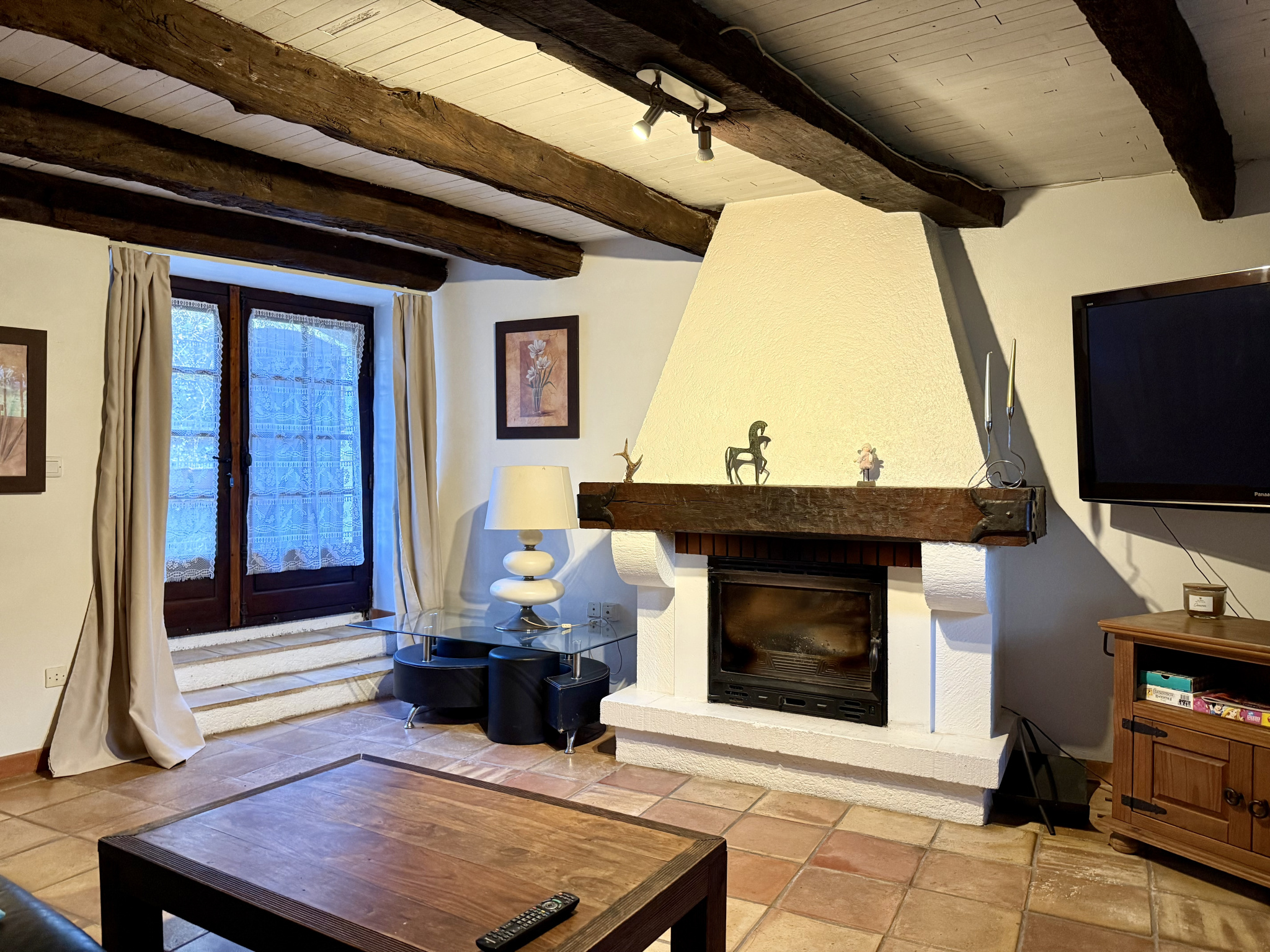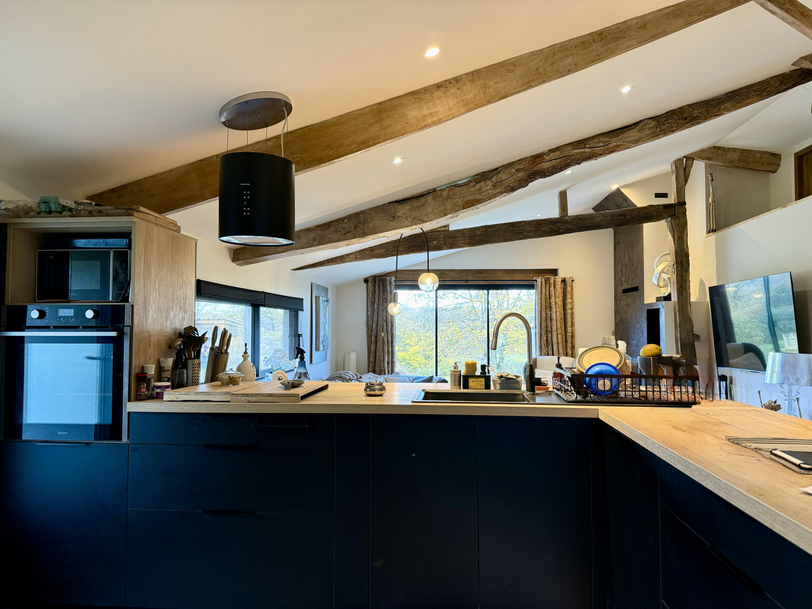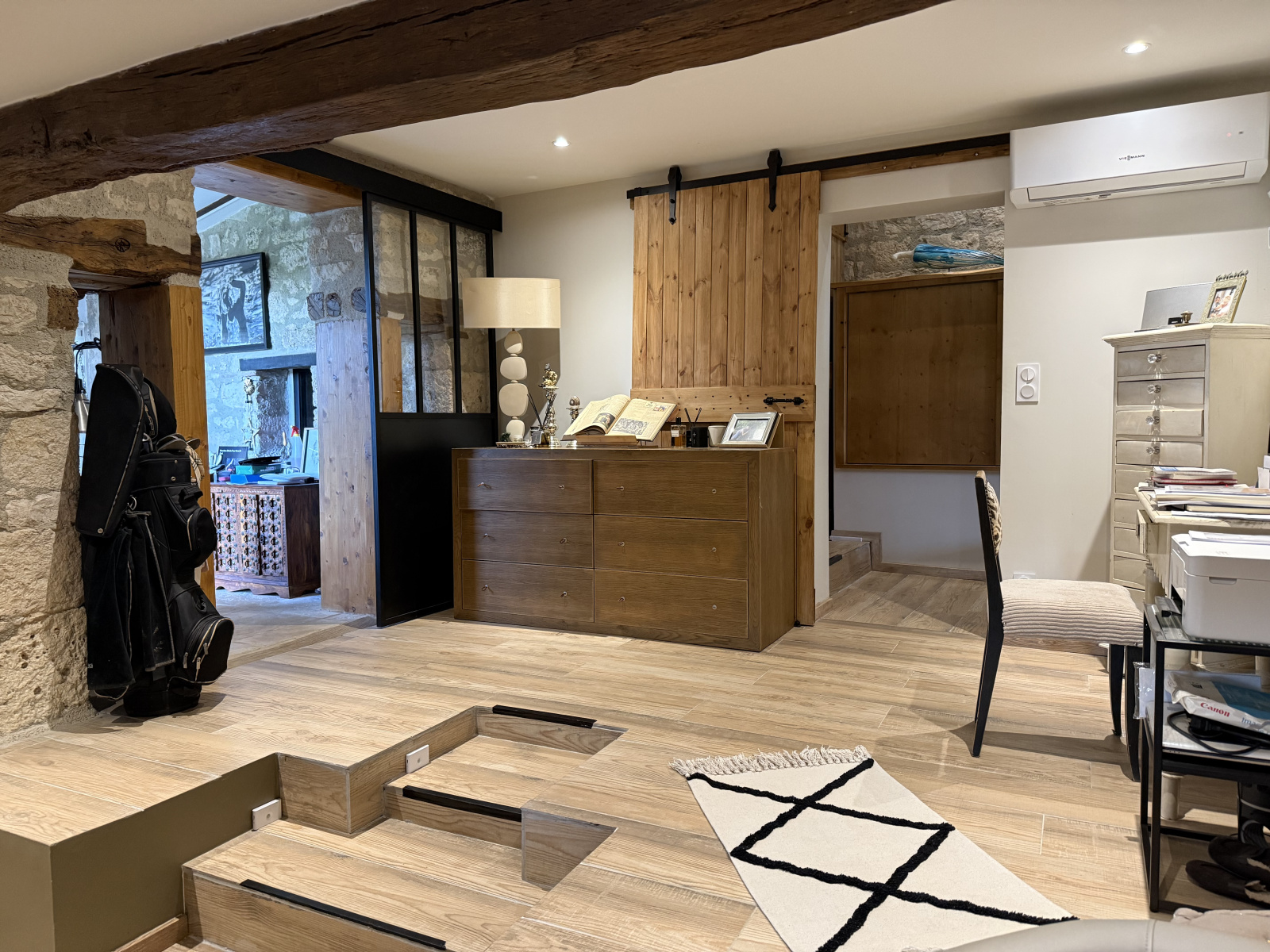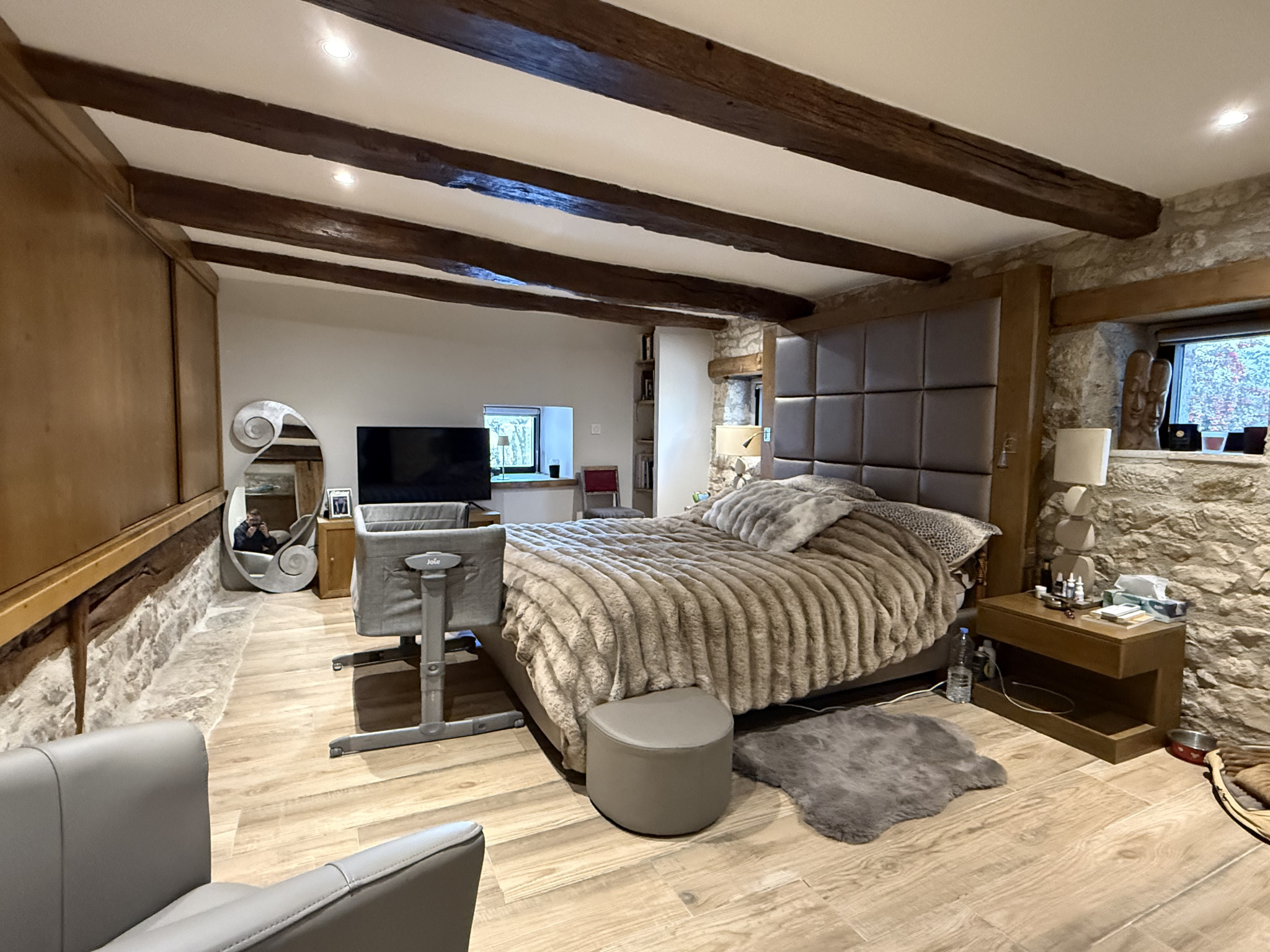 La grange rénovée qui est l’habitation principale à ce jour, offre un espace de vie lumineux, alliant authenticité et modernité. Elle dispose d’une cuisine entièrement équipée, d'une spacieuse pièce de vie avec un poêle à bois encastré, offrant un savant mélange d’ancien et de moderne. Elle comprend deux chambres et une salle d’eau, parfaitement agencées pour le confort quotidien. Climatisation réversible installée.