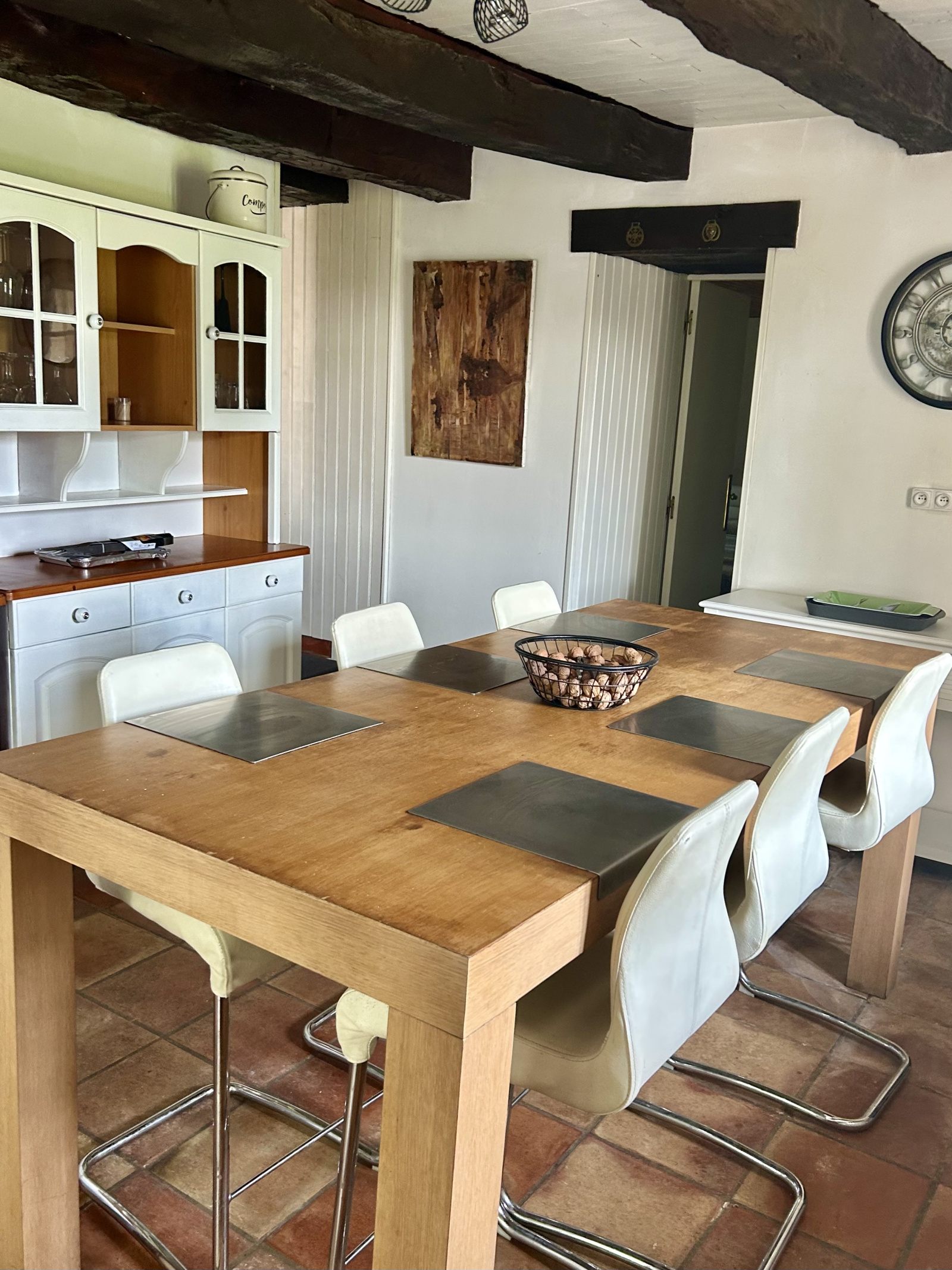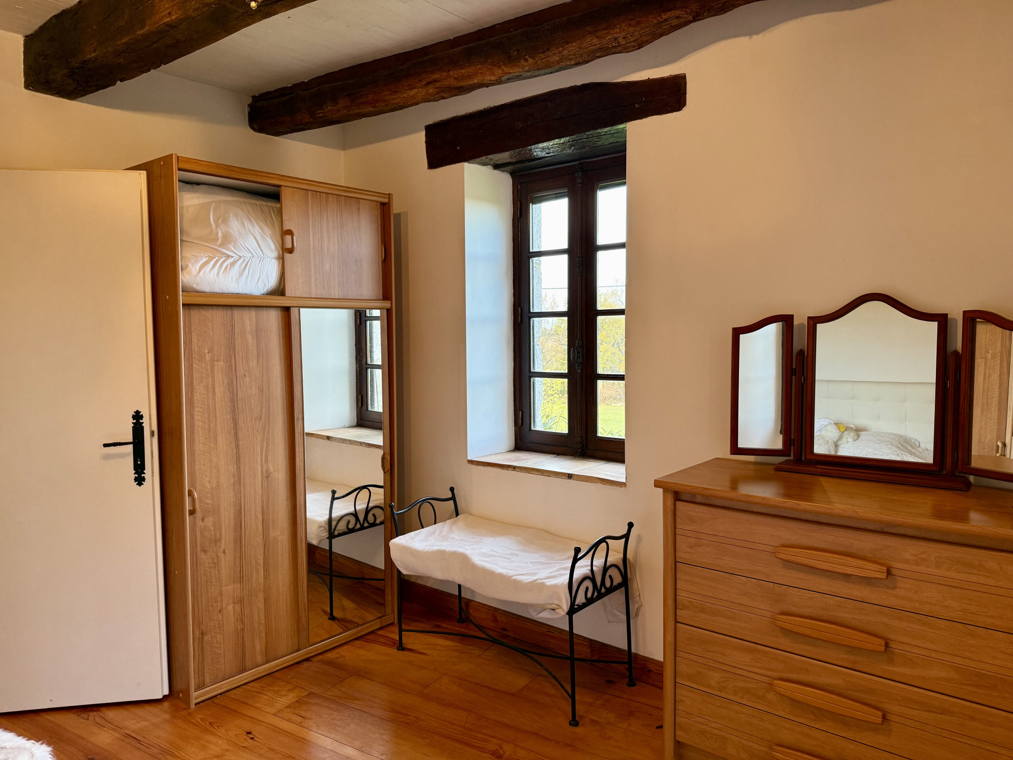 L’ancienne maison principale est aujourd’hui exploitée en gîte et propose quatre chambres spacieuses, ainsi que de belles pièces de vie s’ouvrant sur un vaste parc arboré, avec une vue dégagée sur la campagne environnante et sur les chevaux des propriétés voisines, créant une atmosphère paisible et accueillante.