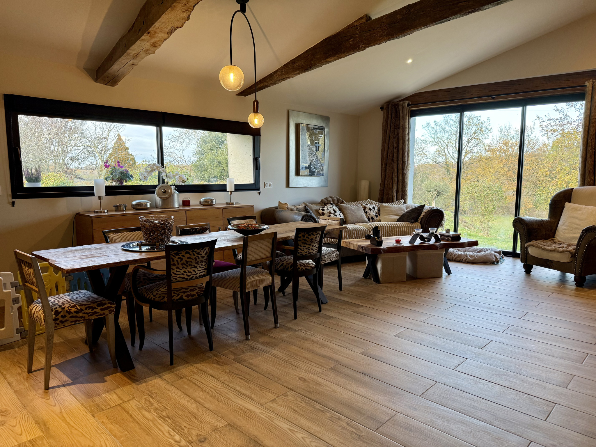 À l’extérieur, la propriété dispose d’un atelier, d’un carport, d’une piscine avec pool house et d’un parc arboré où les paysages lointains se dévoilent au fil des saisons, offrant un cadre parfait pour profiter pleinement de chaque moment de l’année.