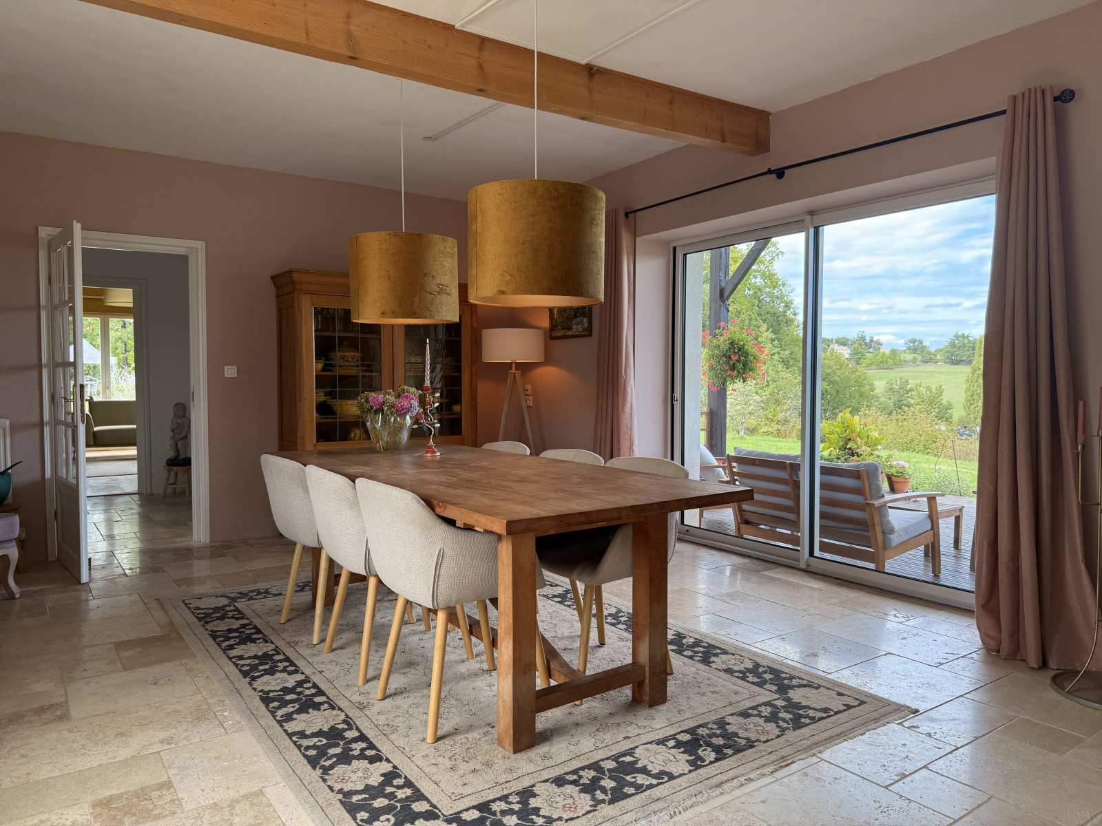 La vaste cuisine équipée avec espace repas, la salle à manger indépendante et le lumineux salon d’angle créent des lieux de vie conviviaux et accueillants. De la salle à manger, de larges baies vitrées coulissantes s’ouvrent sur une terrasse couverte, idéale pour contempler la beauté du paysage à chaque saison.