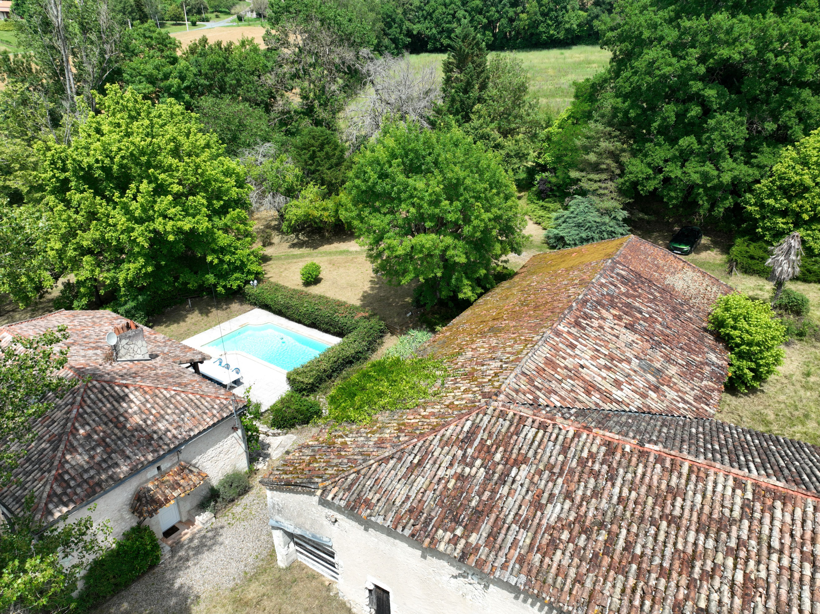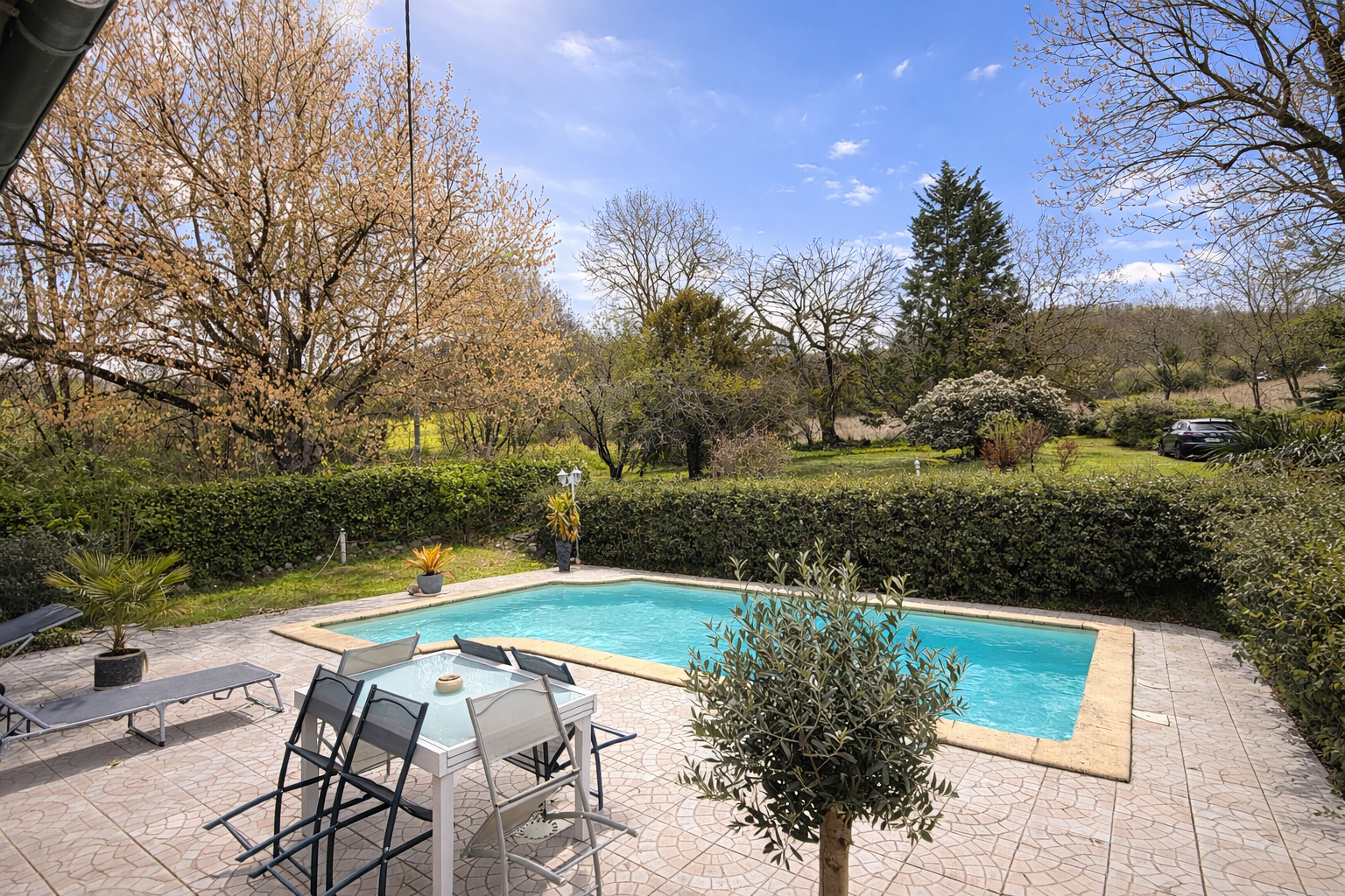 À l’extérieur, vous découvrirez une magnifique piscine, proche de la maison, entourée de beaux arbres et d’un environnement arboré.