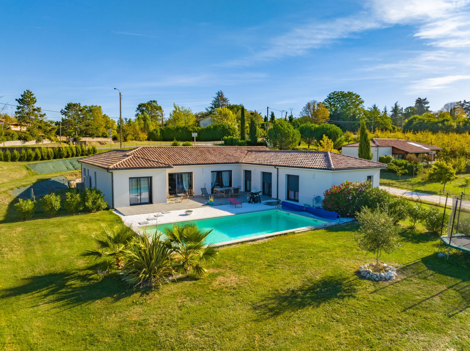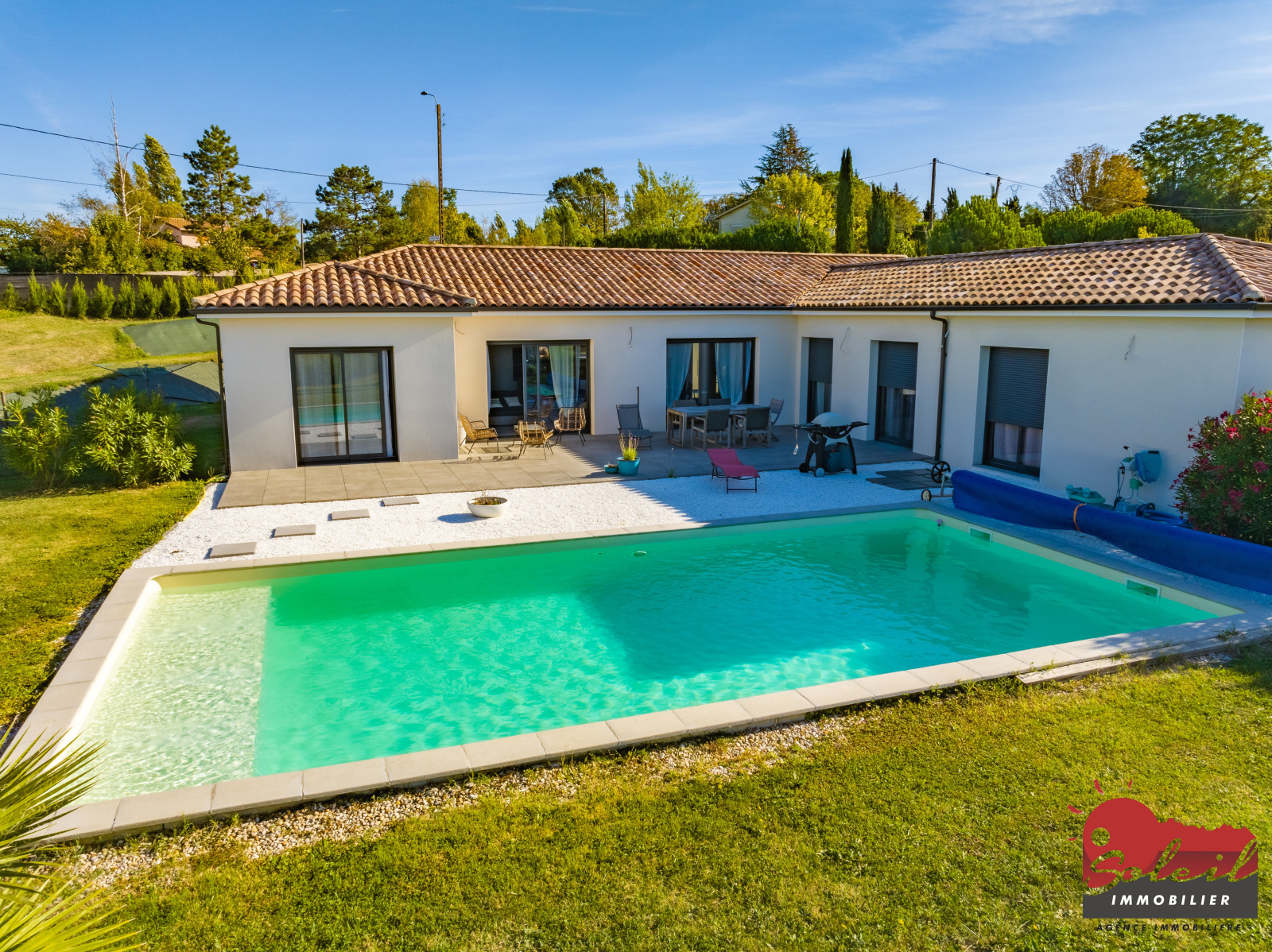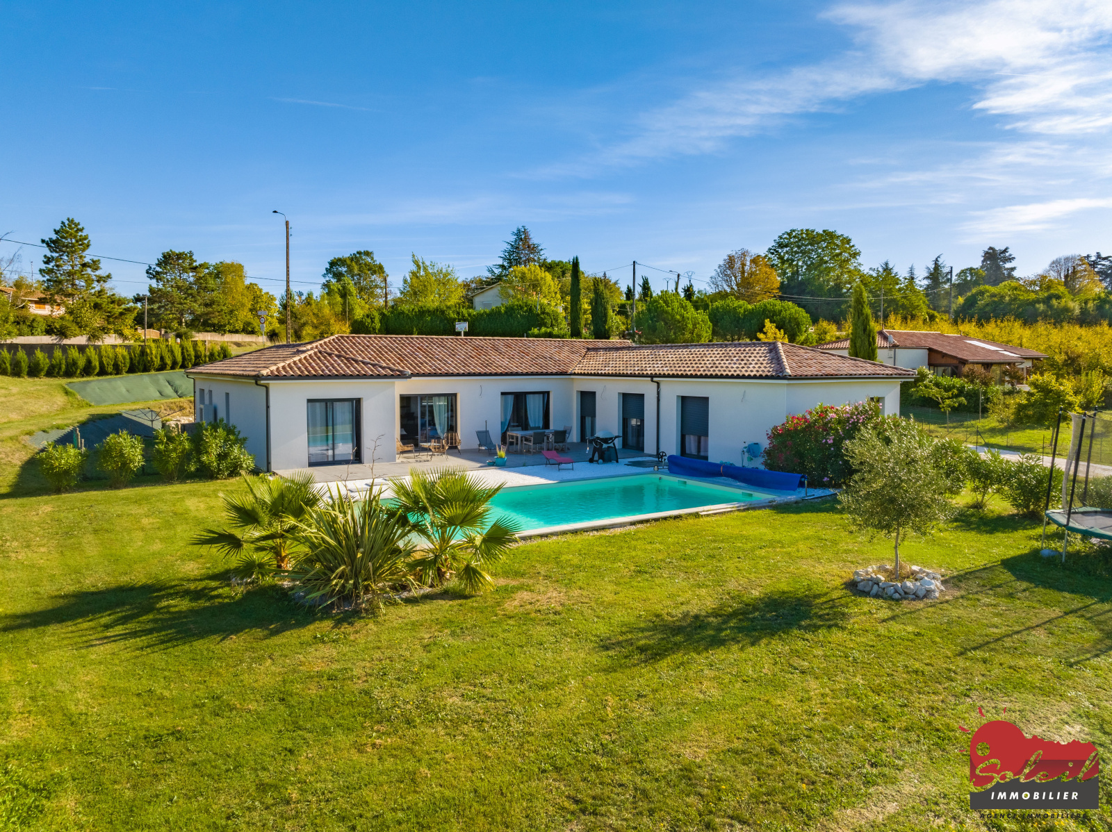 Dans le secteur de Cancon proche des premières commodités très belle maison contemporaine de 174m² de plain-pied édifiée en 2020, l'entrée dessert une très belle pièce à vivre avec cuisine ouverte entièrement équpée avec ilot central . par une porte a galandage on accéde a un cellier puis un garage avec coin buanderie;. Un premier dégagement s'ouvre sur la suite parentale avec dressing , salle d'eau et WC indépendant. A l'opposé un deuxieme coin nuit offrant 4 chambres, une salle d'eau et un WC.Les large baies vitées de la pièce a vivre nous amènent sur une belle terrasse de 57m² avec dans le prolongemernt une piscine de 10x5 m. le chauffage est assuré par pompe a chaleur gainable. Sur un terrain clos de 2007m ² avec portail électrique .