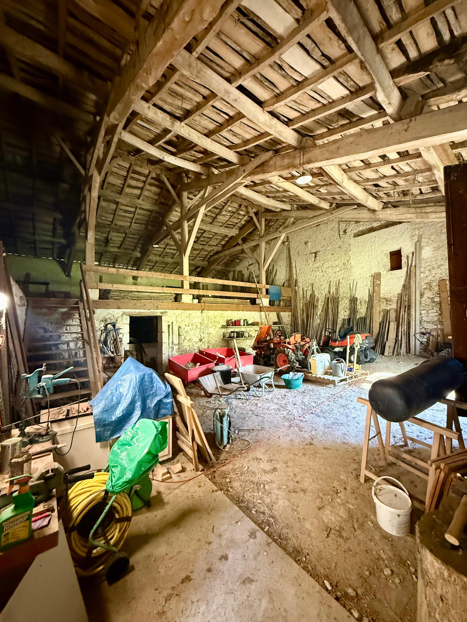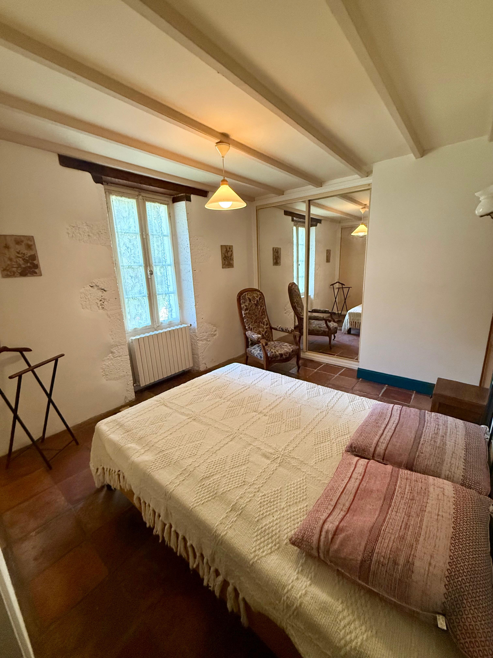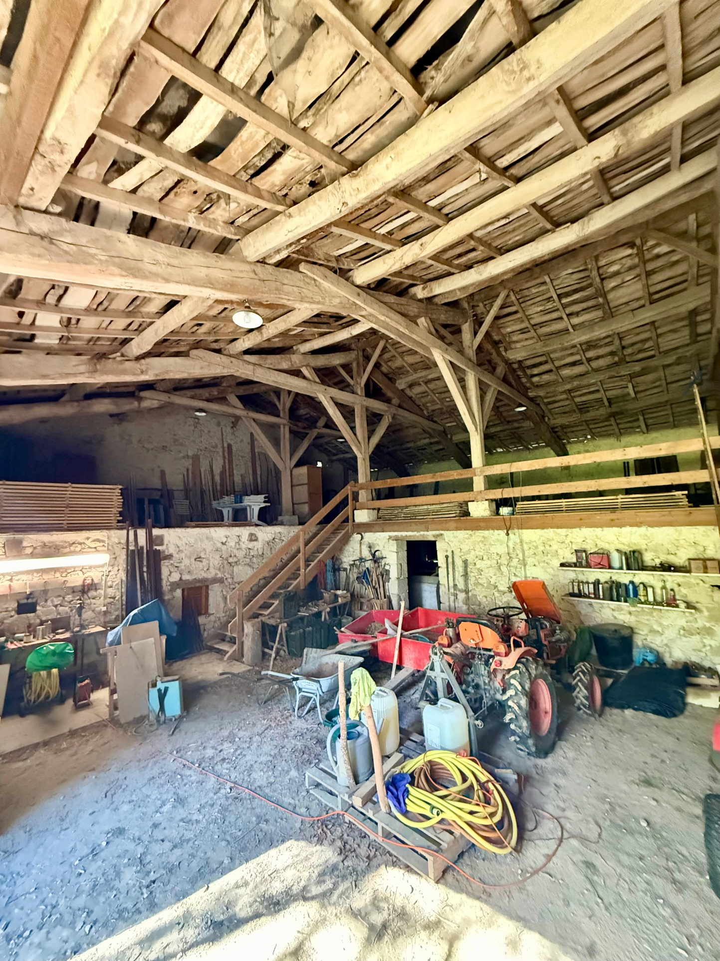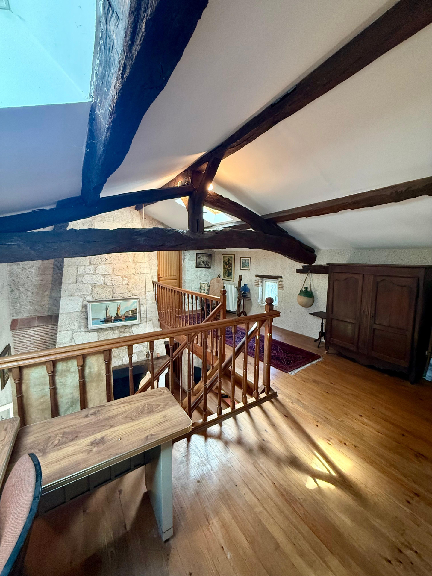 La maison principale, bâtie en pierre, offre de beaux volumes et une atmosphère chaleureuse. On y découvre une véranda ouvrant sur le jardin, un vaste salon séjour d’environ quarante-cinq mètres carrés avec cheminée, une cuisine équipée, ainsi qu’une chambre de quatorze mètres carrés disposant d’un dressing, d’une salle d’eau et d’un WC. À l’étage, une mezzanine d’environ vingt mètres carrés dessert une grande chambre de vingt mètres carrés, une seconde chambre, une salle d’eau avec WC et de nombreux rangements. Le confort est assuré par une pompe à chaleur récente complétée par un chauffage au gaz et au bois. La maison repose sur une cave, dans laquelle se trouve également une cave à vins, idéale pour les amateurs.