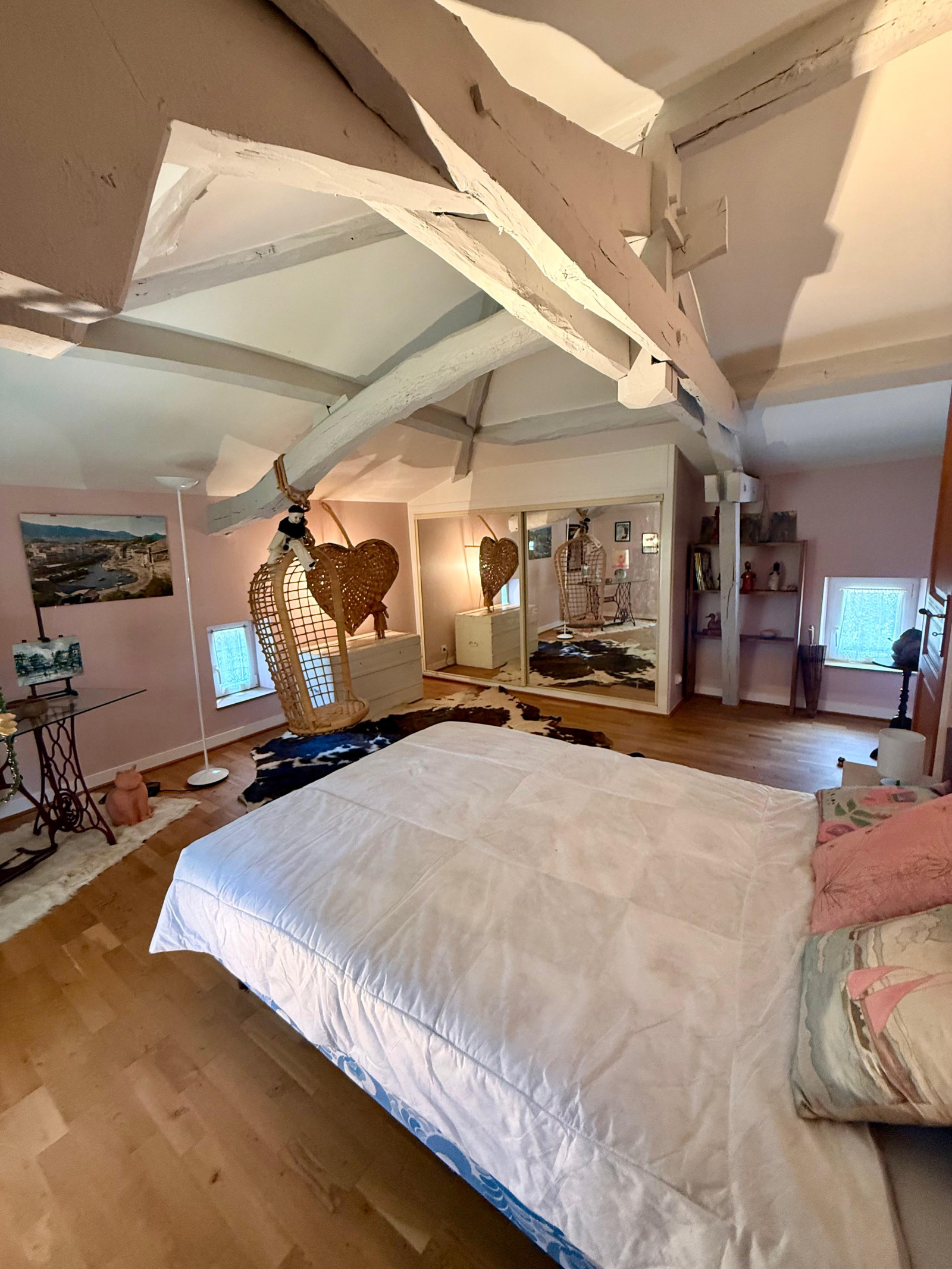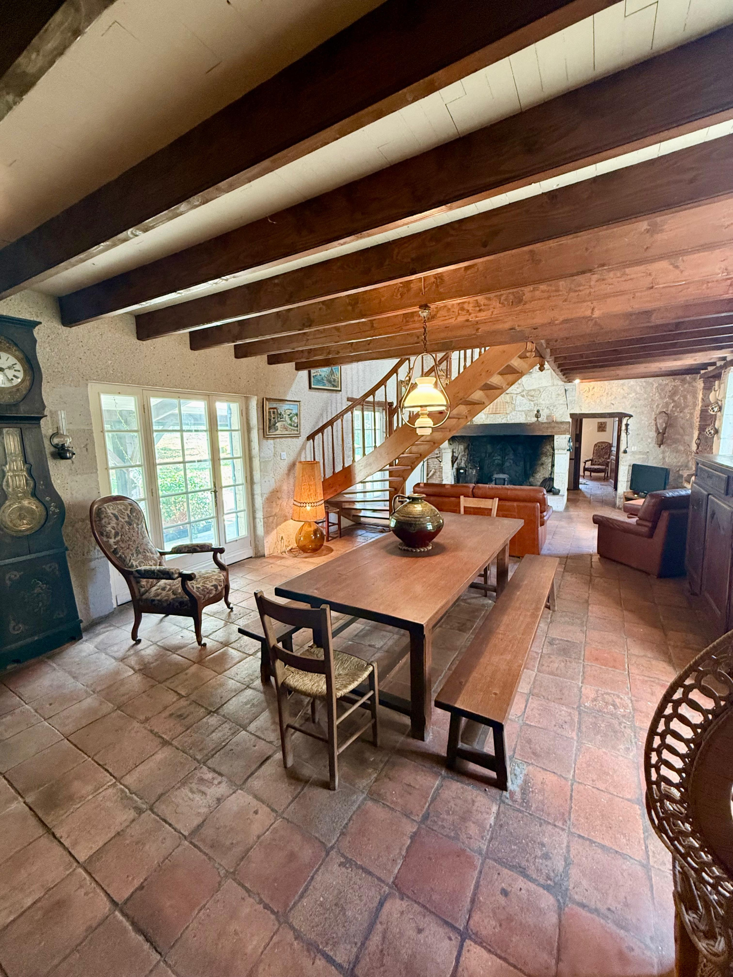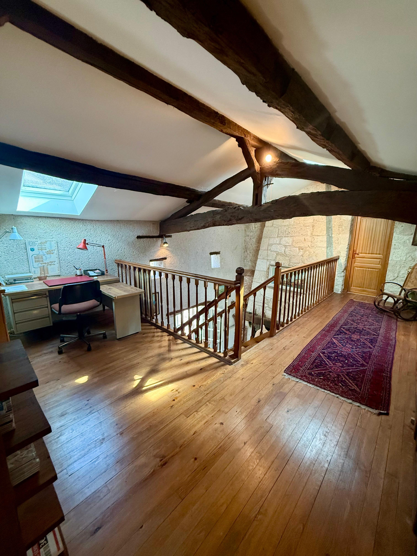 La maison principale, bâtie en pierre, offre de beaux volumes et une atmosphère chaleureuse. On y découvre une véranda ouvrant sur le jardin, un vaste salon séjour d’environ quarante-cinq mètres carrés avec cheminée, une cuisine équipée, ainsi qu’une chambre de quatorze mètres carrés disposant d’un dressing, d’une salle d’eau et d’un WC. À l’étage, une mezzanine d’environ vingt mètres carrés dessert une grande chambre de vingt mètres carrés, une seconde chambre, une salle d’eau avec WC et de nombreux rangements. Le confort est assuré par une pompe à chaleur récente complétée par un chauffage au gaz et au bois. La maison repose sur une cave, dans laquelle se trouve également une cave à vins, idéale pour les amateurs.
