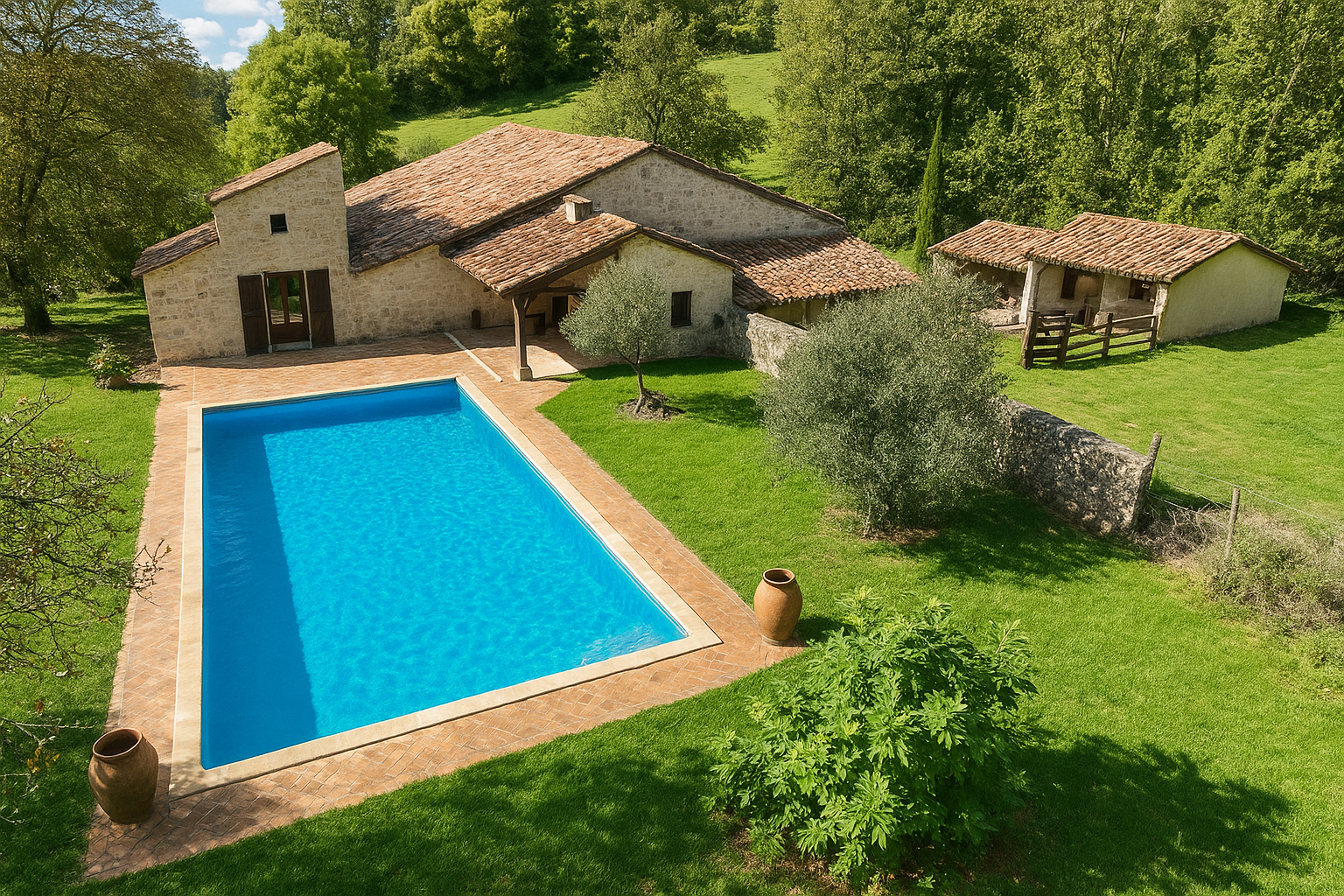 À l’extérieur, le cadre est idyllique. Une belle piscine de douze mètres sur cinq au chlore invite à la détente et profite d’une exposition ensoleillée tout au long de la journée. Le jardin, parfaitement entretenu, est agrémenté d’une mare naturelle permettant l’arrosage, d’un puits et d’une fontaine ornée de nénuphars. L’ensemble des bâtiments présente une structure solide et des toitures en excellent état.