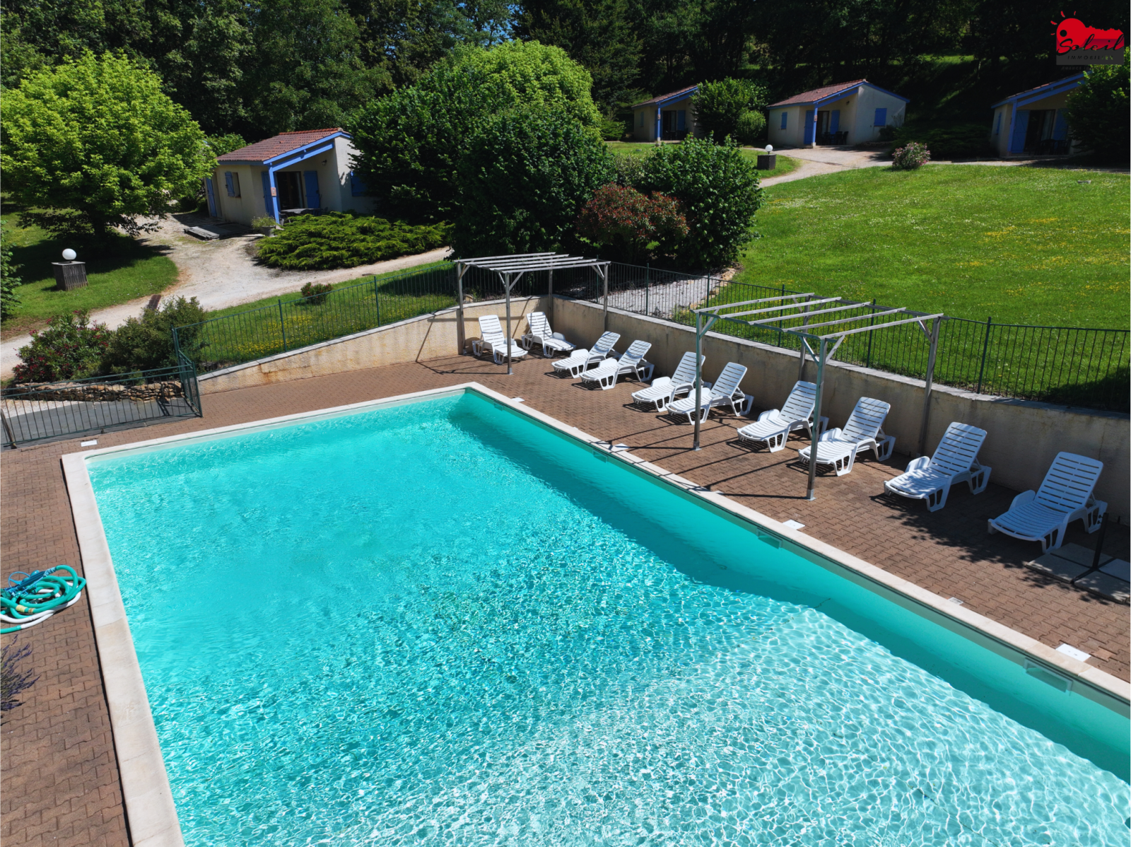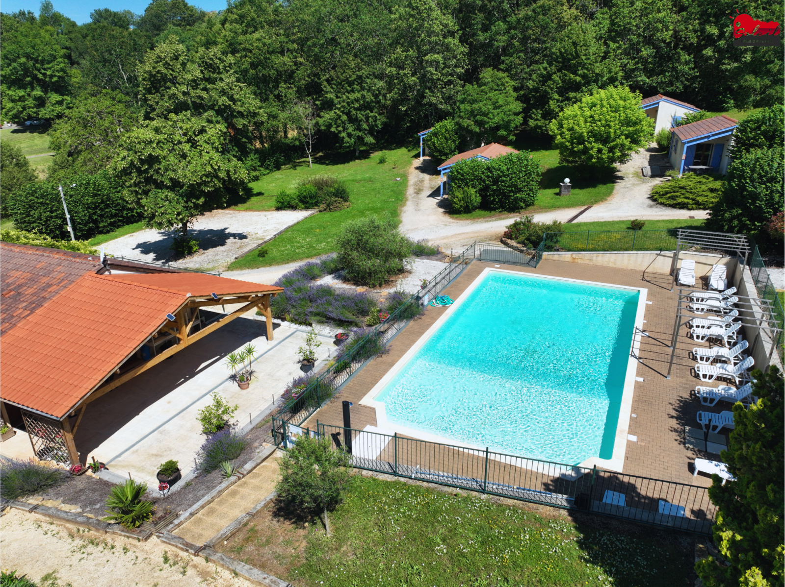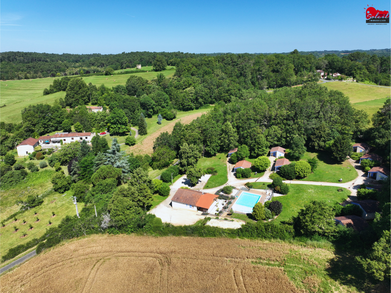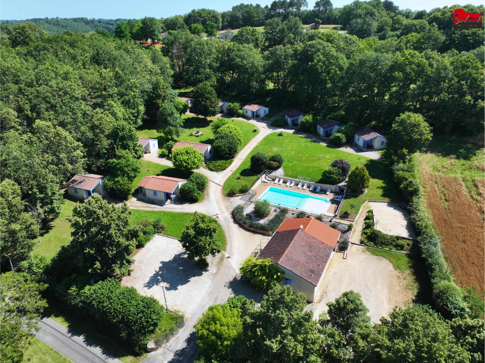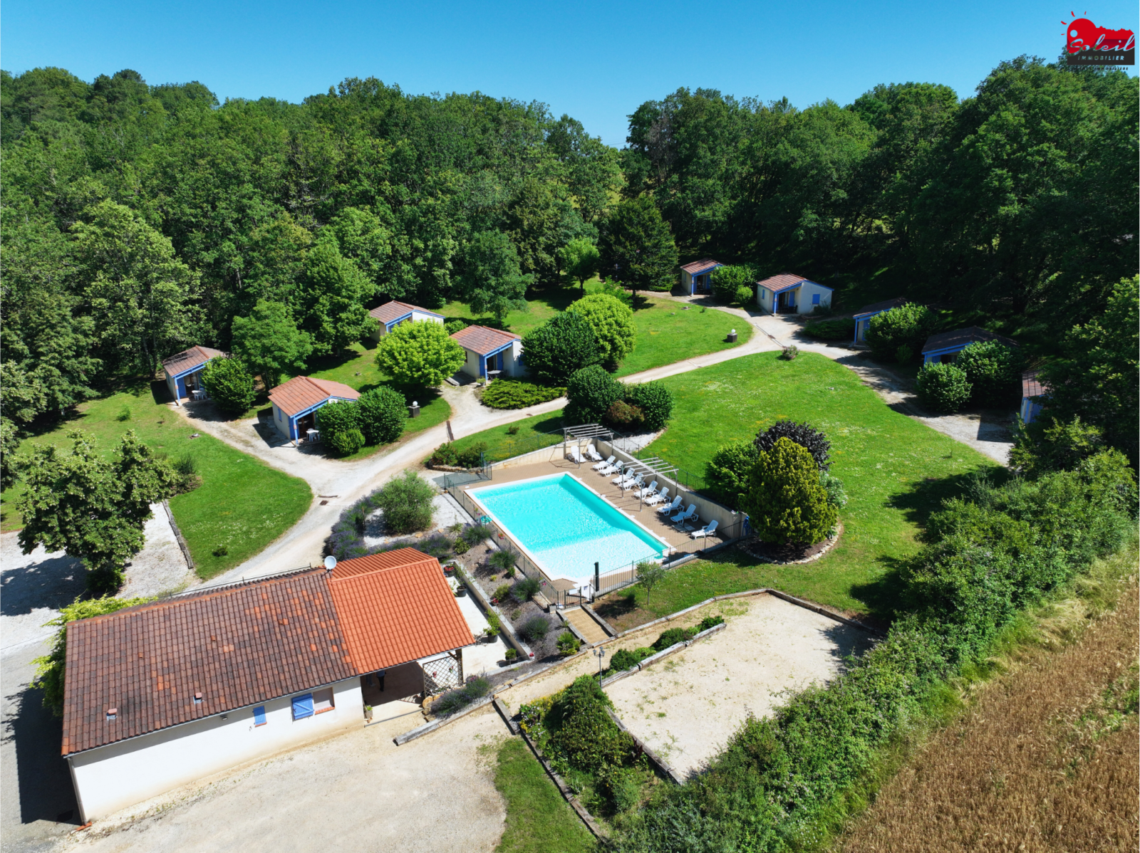 En pleine nature, aux portes de la Dordogne, Ensemble de 10 gîtes meublés et équipés d'environ 40 m² (composé de 2 chambres, une pièce à vivre avec kitchinette et salle d'eau avec WC et terrasse privée) sur 2.5 Ha de terrain boisé et arboré, avec piscine 15 x 8 (refaite à neuf) aire de jeux, table de ping-pong, boulodrome, terrain de badminton, parking. Une salle de réception avec terrasse couverte de 100 m² avec cuisine professionnelle peut être utilisée comme restaurant, salle de réception ou être transformée en grand gîte. Fort potentiel de développement, Possibilité de vente en cession de parts.