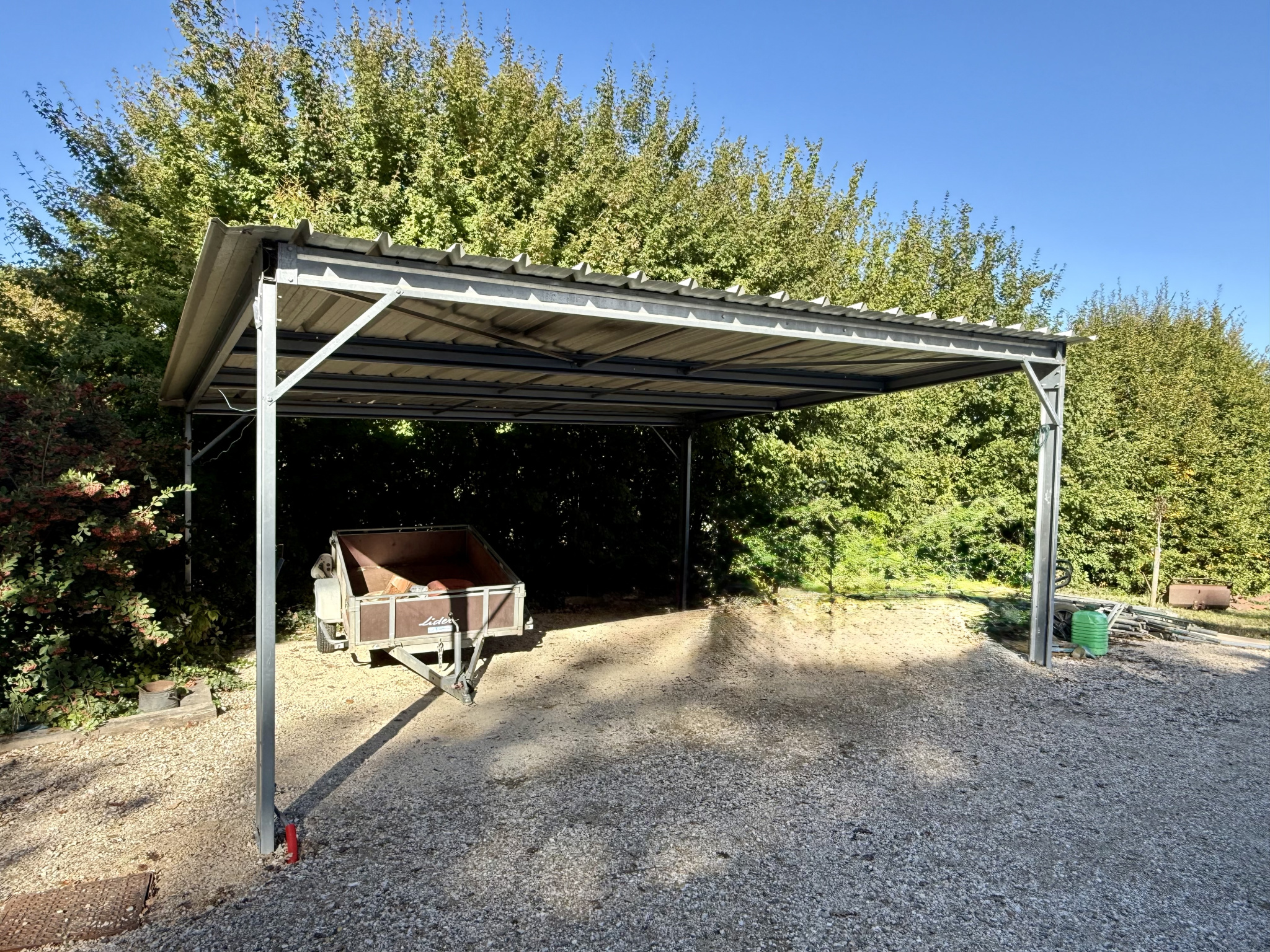 À l’extérieur, vous profiterez d’une grande terrasse permettant de savourer la tranquillité des lieux, ainsi que d’un carport et d’un petit atelier. Un sous-sol d’environ 25 m² offre également un bel espace de rangement supplémentaire.